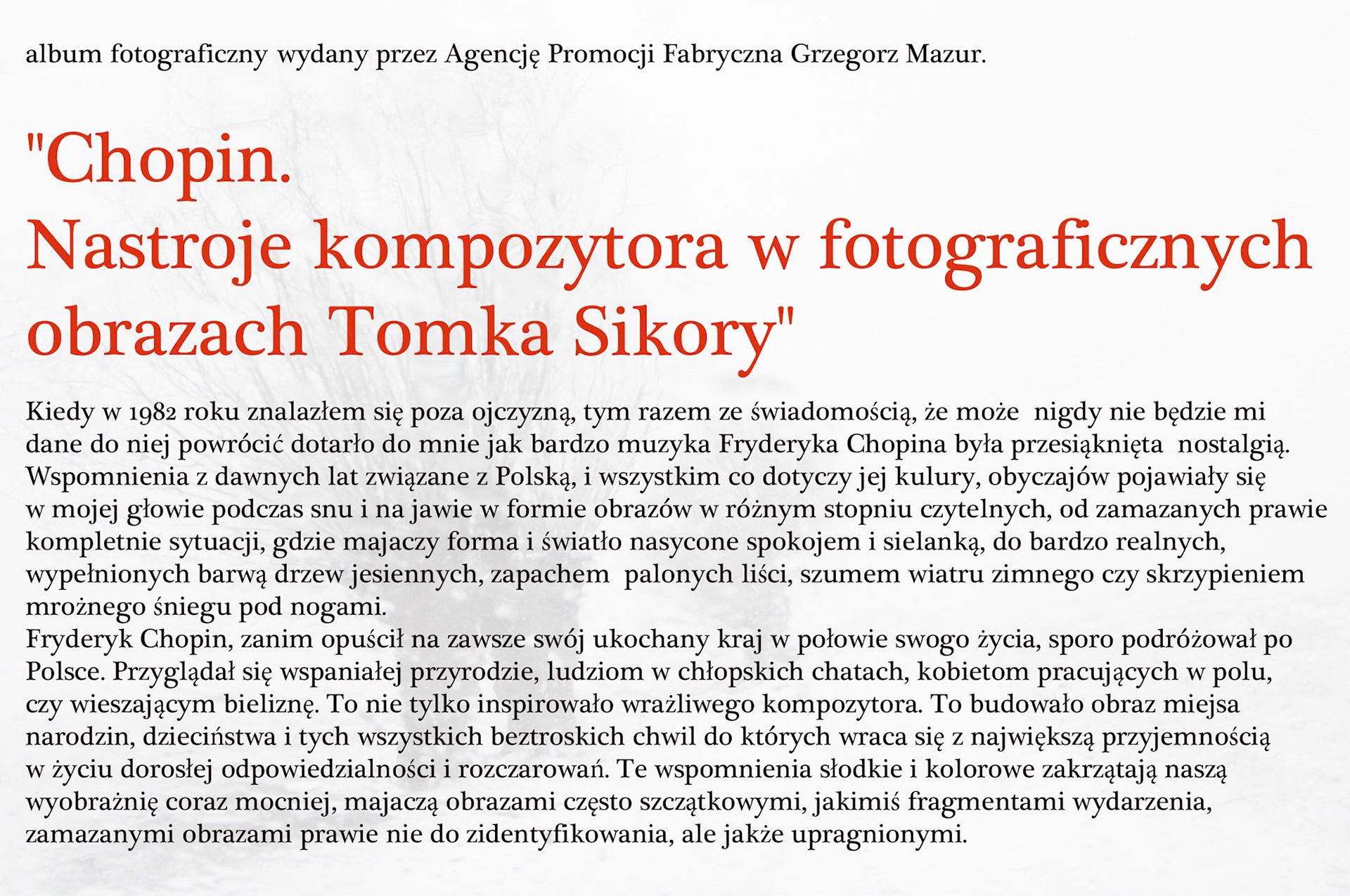 "Chopin. Nastroje kompozytora w fotograficznych obrazach Tomka Sikory” Kiedy w 1982 roku znalazłem się poza ojczyzna, tym razem ze świadomością, ze może nigdy nie będzie mi dane do niej powrócić dotarto do mnie jak bardzo muzyka Fryderyka Chopina była przesiąknięta nostalgia. Wspomnienia z dawnych lat związane z Polska, i wszystkim co dotyczy jej kultury, obyczajów pojawiały się w mojej głowie podczas snu i na jawie w formie obrazów w różnym stopniu czytelnych, od zamazanych prawie kompletnie sytuacji, odzie majaczy forma i światło nasycone spokojem i sielanka, do bardzo realnych, wypełnionych barwa drzew jesiennych, zapachem palonych liści, szumem wiatru zimnego czy skrzypieniem mroźnego śniegu pod nogami. Fryderyk Chopin, zanim opuścił na zawsze swój ukochany kraj w połowie swego życia, sporo podróżował po Polsce. Przyglądał się wspaniałej przyrodzie, ludziom w chłopskich chatach, kobietom pracujących w polu, czy wieszającym bieliznę. To nie tylko inspirowało wrażliwego kompozytora. To budowało obraz miejsca narodzin, dzieciństwa i tych wszystkich beztroskich chwil do których wraca sie z najwieksza przyjemnością w życiu dorosłej odpowiedzialności i rozczarowań. Te wspomnienia słodkie i kolorowe zakrzątają nasza wyobraźnie coraz mocniej, majaczą obrazami często szczątkowymi, jakimiś fragmentami wydarzenia, zamazanymi obrazami prawie nie do zidentyfikowania, ale jakże upragnionymi.