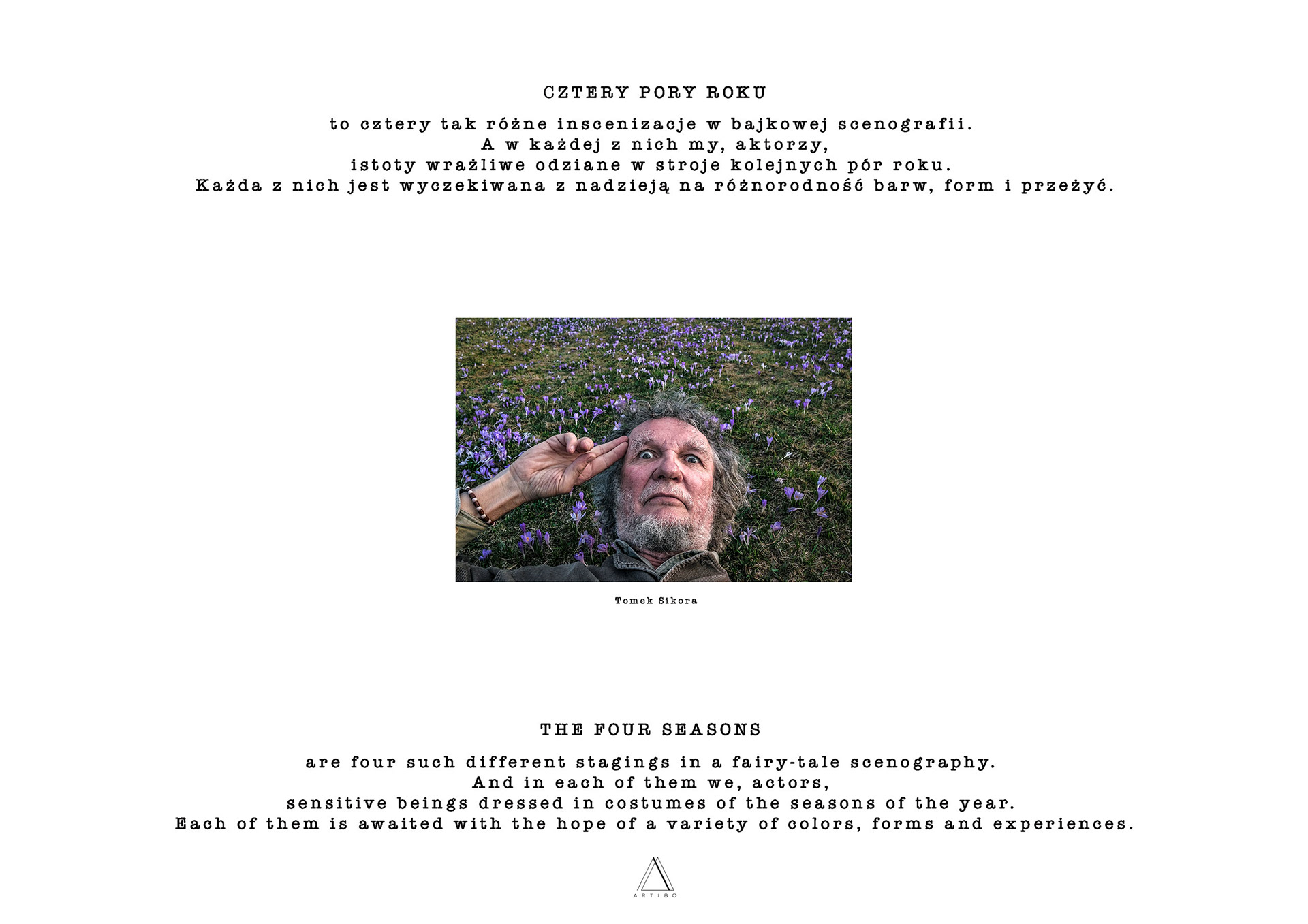 CZTERY PORY ROKU to oztery tak różne inscenizacje w bajkowej scenografii. A w każdej z nich my, aktorzy, istoty wrazliwe odziane w stroje kolejnych pór roku. Każda z nich jest wyczekiwana z nadzieją na róznorodność barw, form i przeżyć. THE FOUR SEASONS are four such different stagings in a fairy-tale scenography. And in each of them we, actors, sensitive beings dressed in costumes of the seasons of the year. Each of them is awaited with the hope of a variety of colours, forms and experiences.