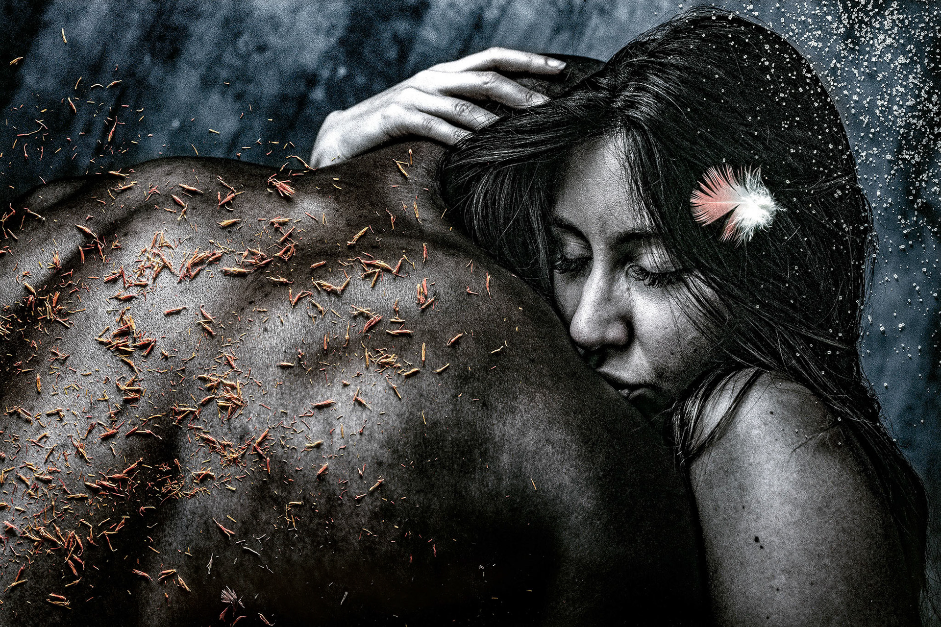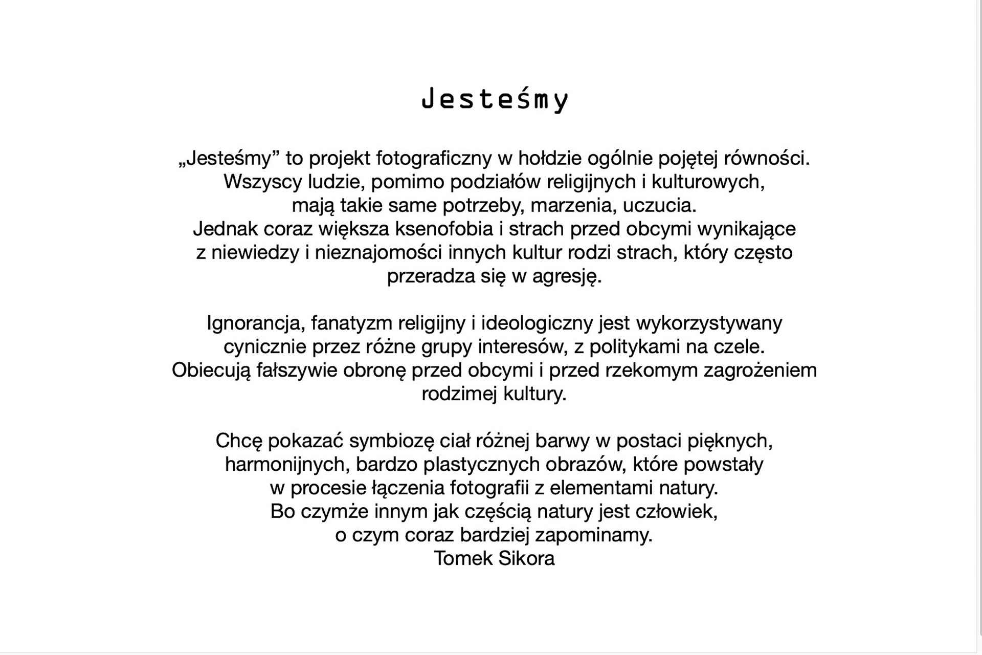 „Jesteśmy" to projekt fotograficzny w hołdzie ogólnie pojętej równości. Wszyscy ludzie, pomimo podziałów religijnych i kulturowych, maja takie same potrzeby, marzenia, uczucia. Jednak coraz wiekszą ksenofobia i strach przed obcymi wynikające z niewiedzy i nieznajomości innych kultur rodzi strach, który często przeradza się w agresje. Ignorancja, fanatyzm religijny i ideologiczny jest wykorzystywany cynicznie przez różne grupy interesów, z politykami na czele. Obiecują fałszywie obronę przed obcymi i przed rzekomym zagrożeniem rodzimej kultury. Chce pokazać symbiozę ciał różnej barwy w postaci pięknych, harmonijnych, bardzo plastycznych obrazów, które powstały w procesie łączenia fotografii z elementami natury. Bo czymże innym jak częścią natury jest człowiek, o czym coraz bardziej zapominamy. Tomek Sikora