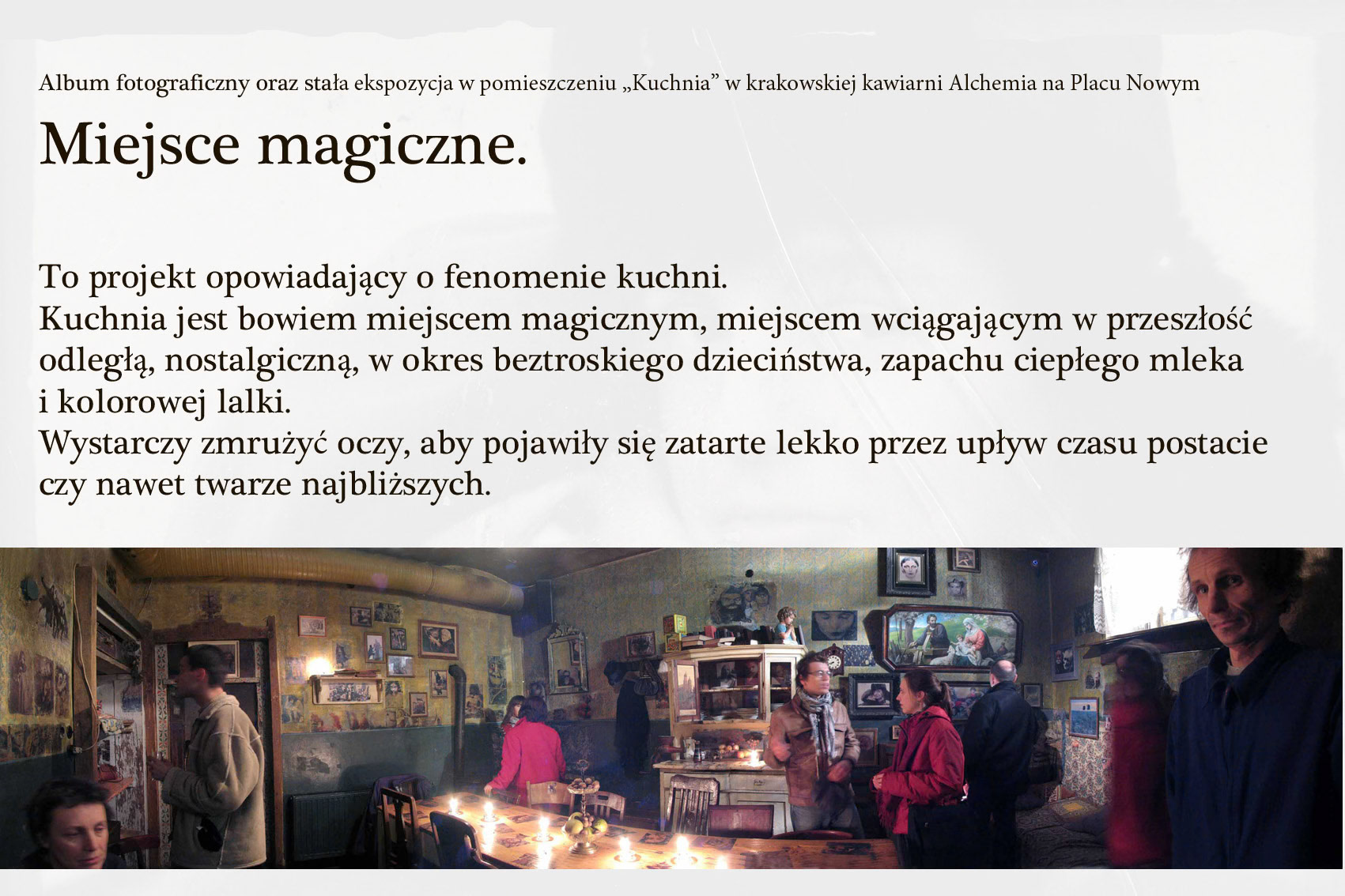 Album fotograficzny oraz stała ekspozycja w pomieszczeniu „Kuchnia" w krakowskiej kawiarni Alchemia na Placu Nowym. “Miejsce magiczne” to projekt opowiadający o fenomenie kuchni. Kuchnia jest bowiem miejscem magicznym, miejscem wciągającym w przeszłość odległą, nostalgiczna, w okres beztroskiego dzieciństwa, zapachu ciepłego mleka i kolorowej lalki. Wystarczy zmrużyć oczy, aby pojawiły się zatarte lekko przez upływ czasu postacie czy nawet twarze najbliższych.